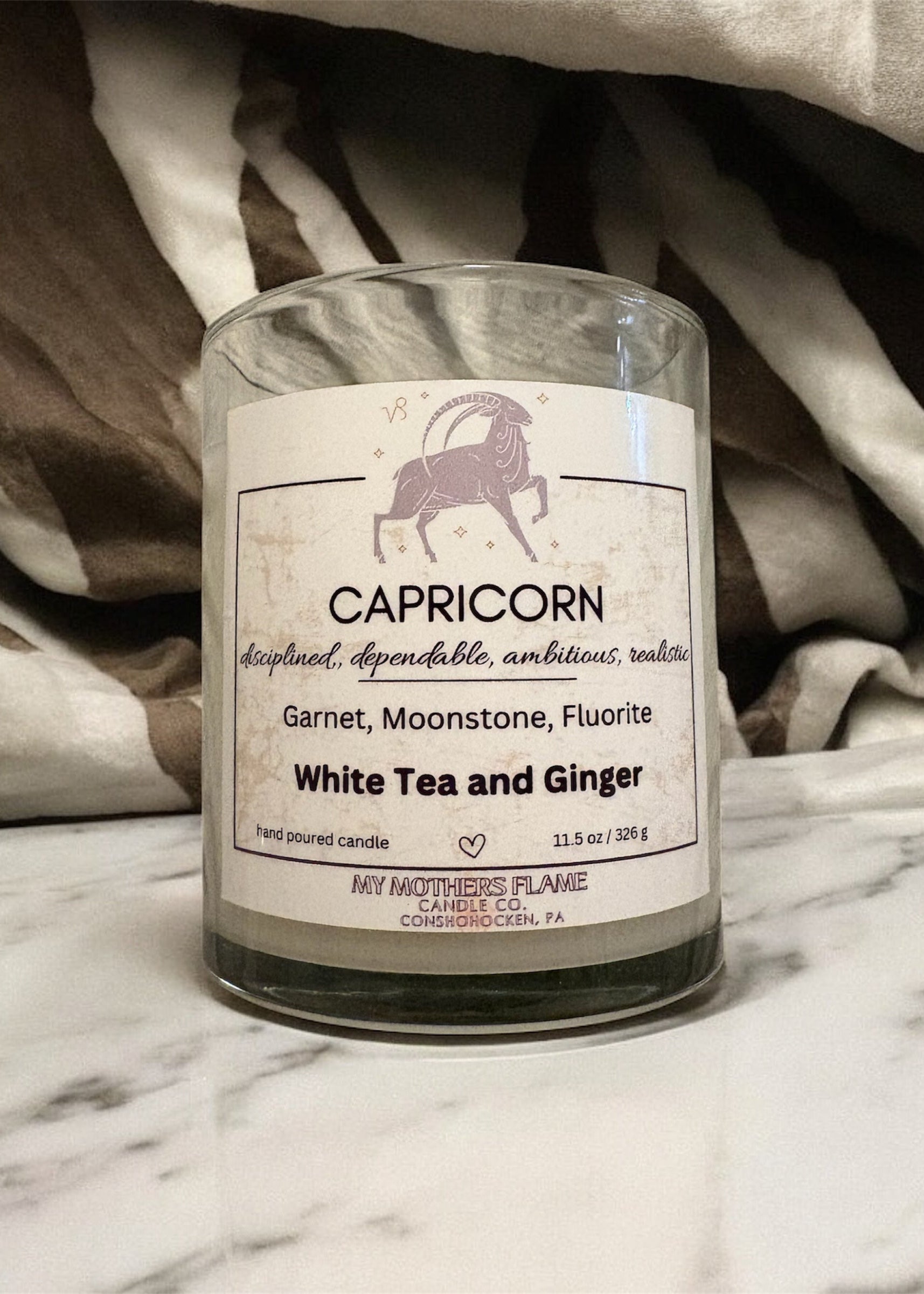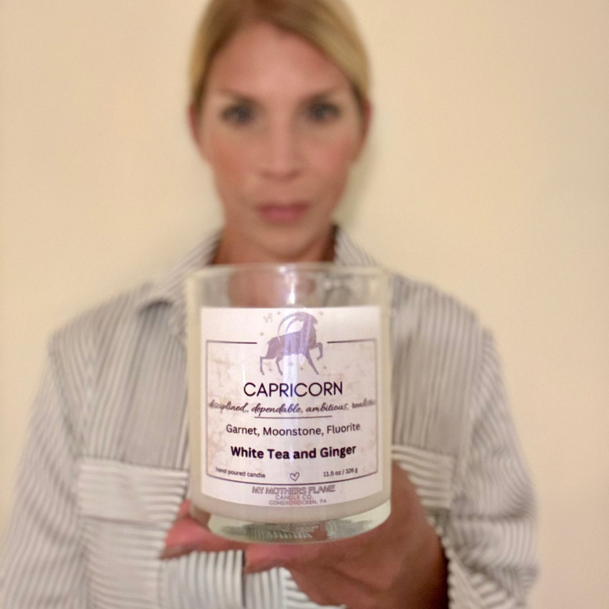 Our Capricorn Zodiac Candle is infused with grounding crystals and a crisp white tea and ginger scent. Designed to reflect Capricorn’s disciplined, dependable, ambitious, and realistic nature. Light it to channel determination, clarity, and a calm, unwavering energy.