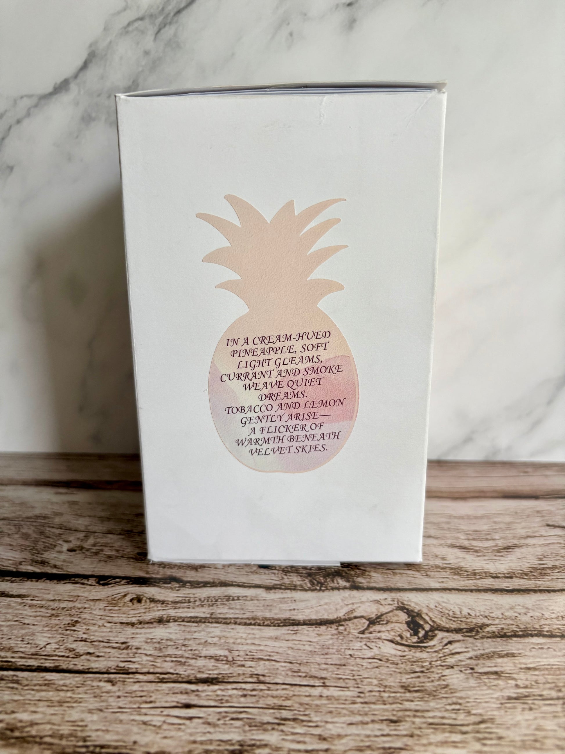 In a cream-hued pineapple, soft light gleams, Currant and smoke weave quiet dreams. Tobacco and lemon gently arise— A flicker of warmth beneath velvet skies.