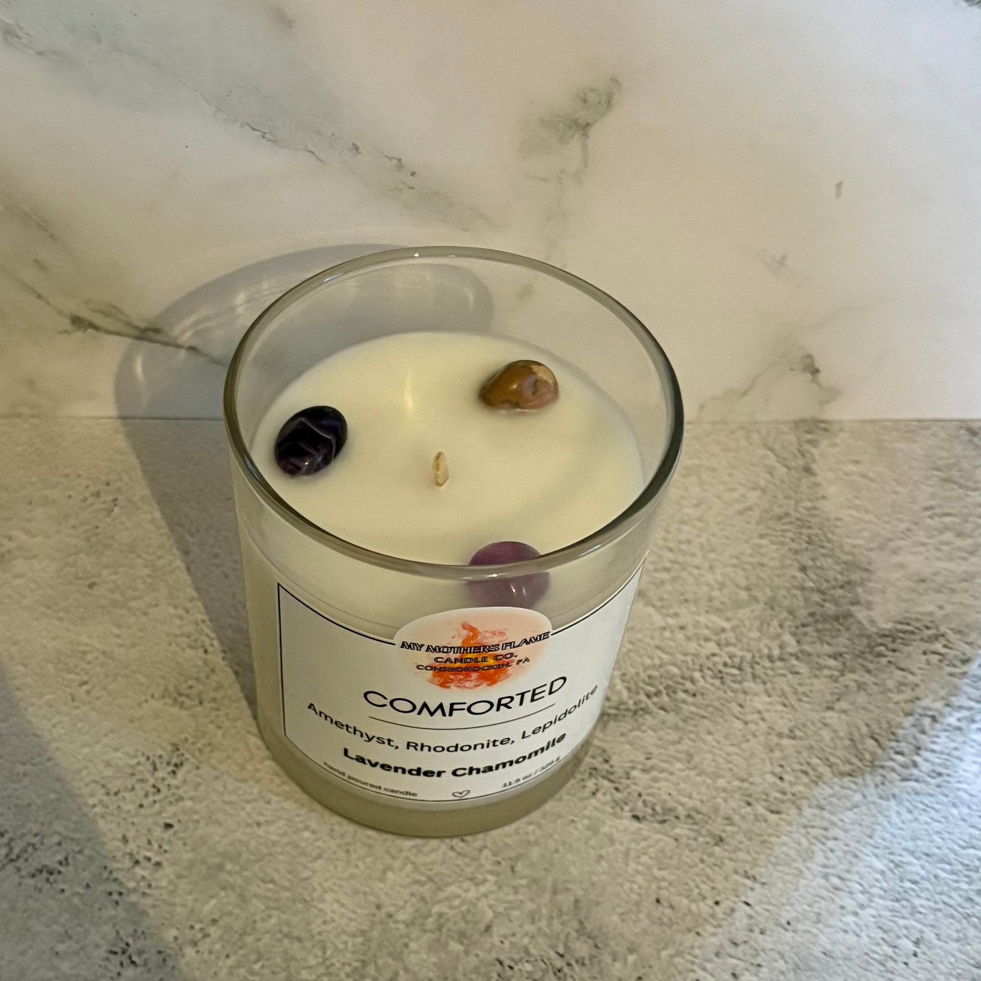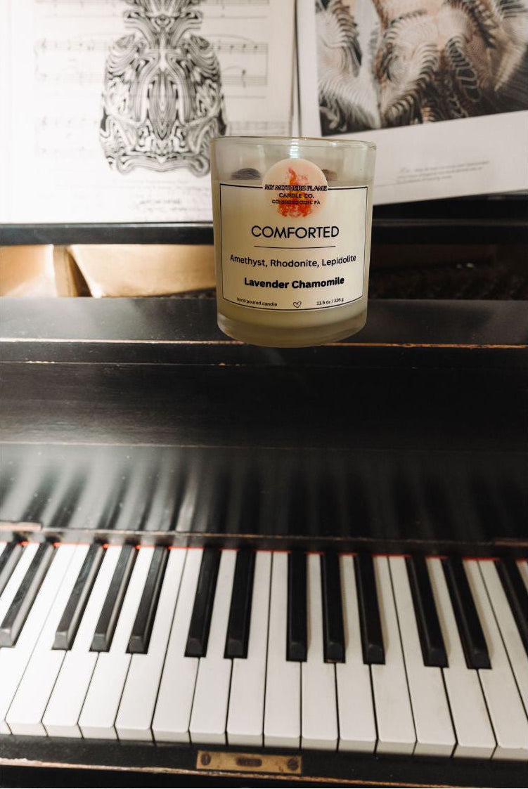 Our Comforted Candle is infused with comforting crystals and a soothing scent blend. Crafted to support emotional healing, bring peace to your heart, and encourage personal growth during times challenge or loss.