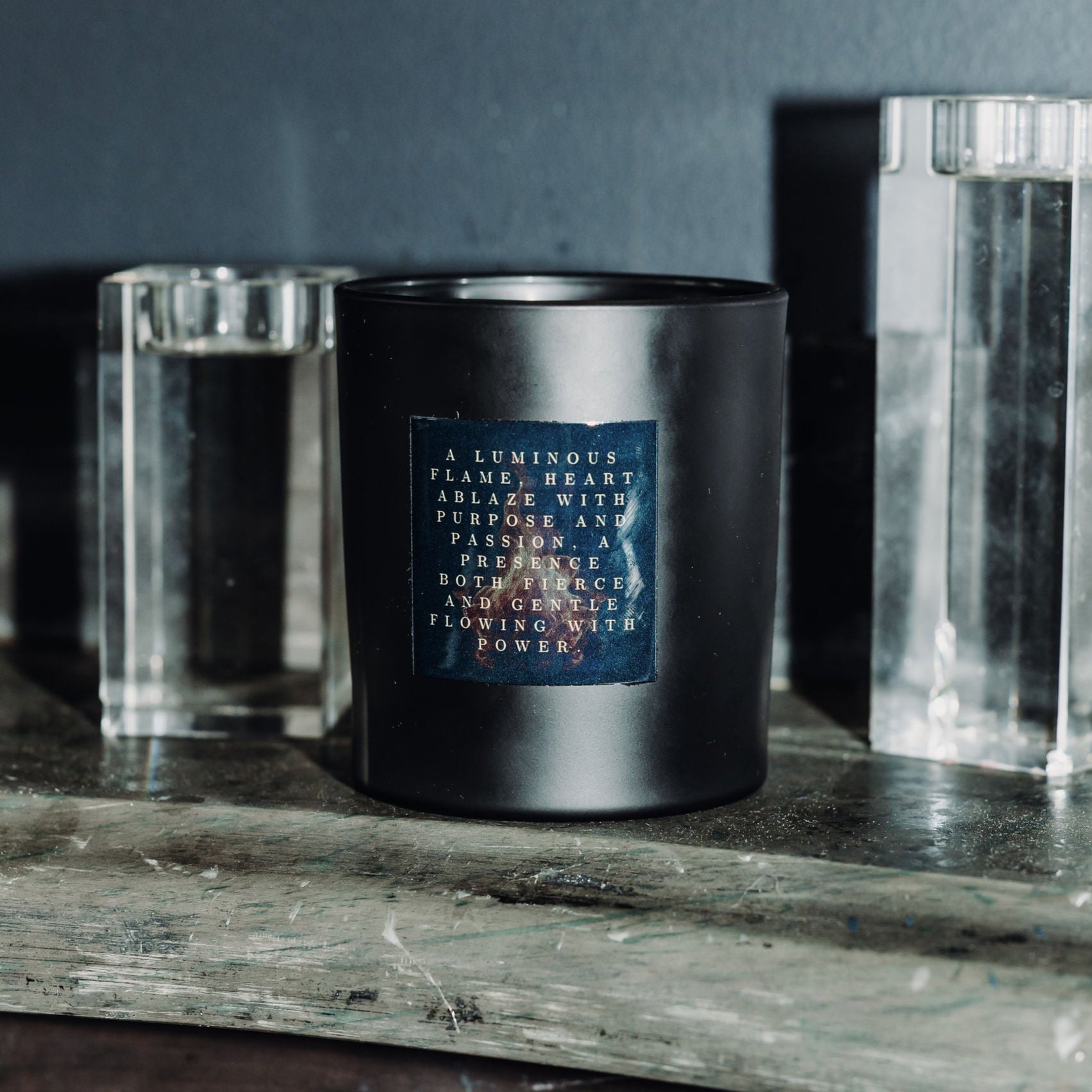 A luminous flame, heart ablaze with purpose and passion, a presence both fierce and gentle, flowing with power.